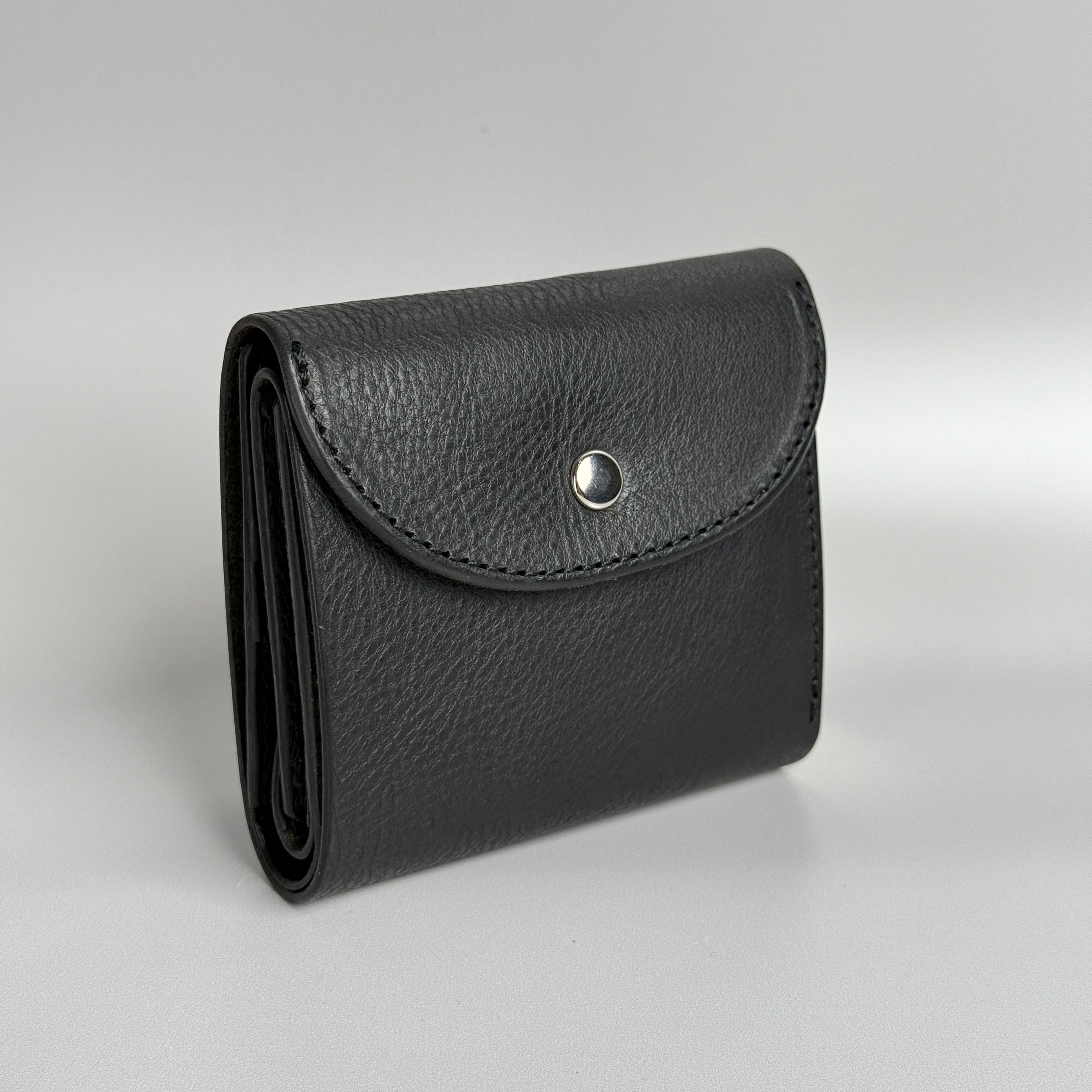 紙幣やカードが取り出しやすく、全体をフタで包み込むようなデザインなので、閉じた際のころっとした形がとても可愛らしく、手に馴染みの良いフタ付きの二つ折りのお財布です。
